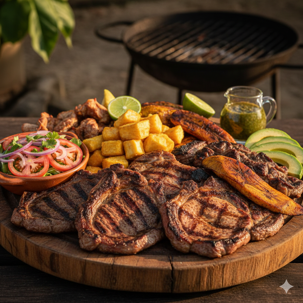 Deliciosa bandeja de carne asada, yuca, plátano, ensalada de tomate y cebolla en julianas, y aguacate en semirodajas, ¡todo listo para provocar un gran apetito!.